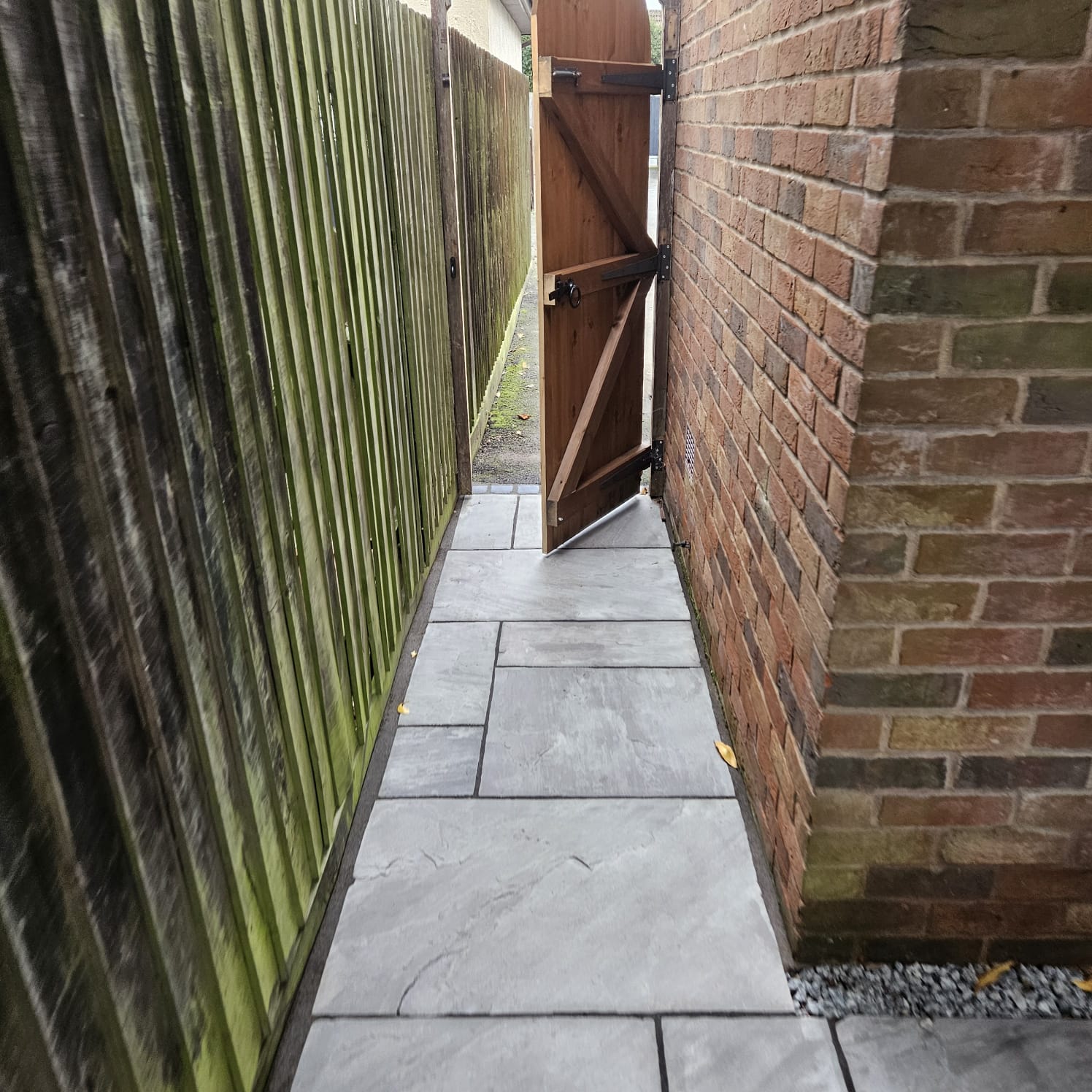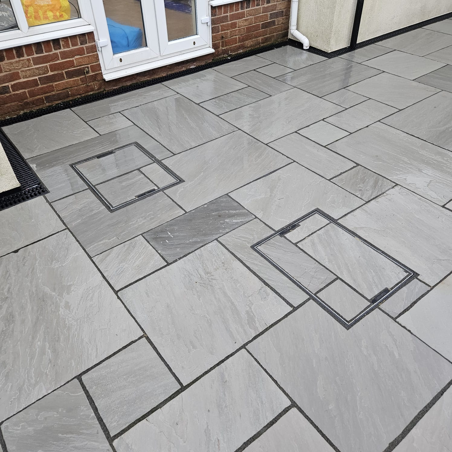 Instillation of a stunning Indian Sandstone patio in Kandela, with a black Limestone block edging. Three recess manholes installed. The patio is finished with a resin grout in Basalt grey, then sealed with natural stone sealer.