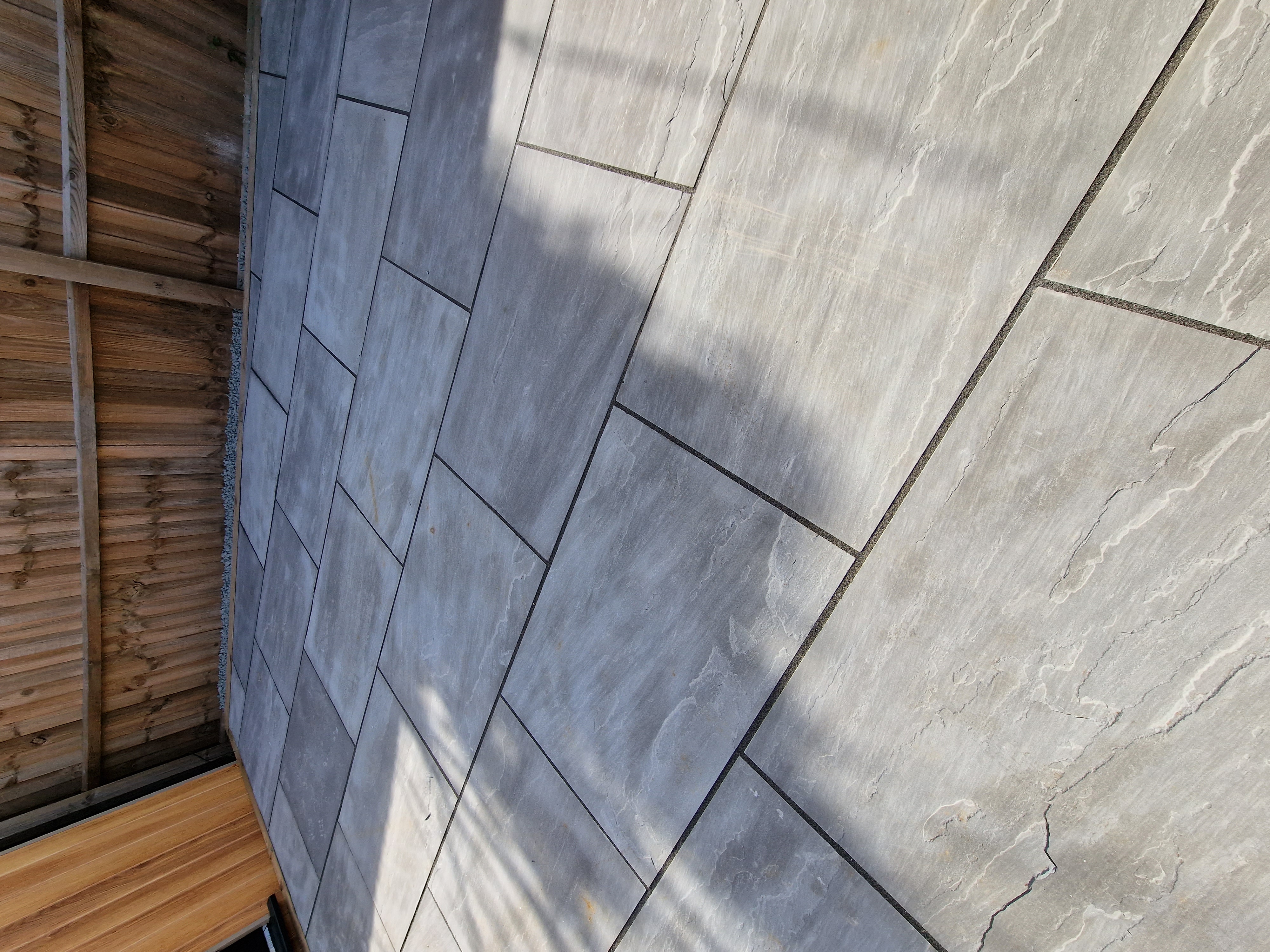 Raised Indian sandstone patio constructed, with Indian sandstone paths going from the patio, along the house and to the shed. Finished with EASYJoint in Basalt.