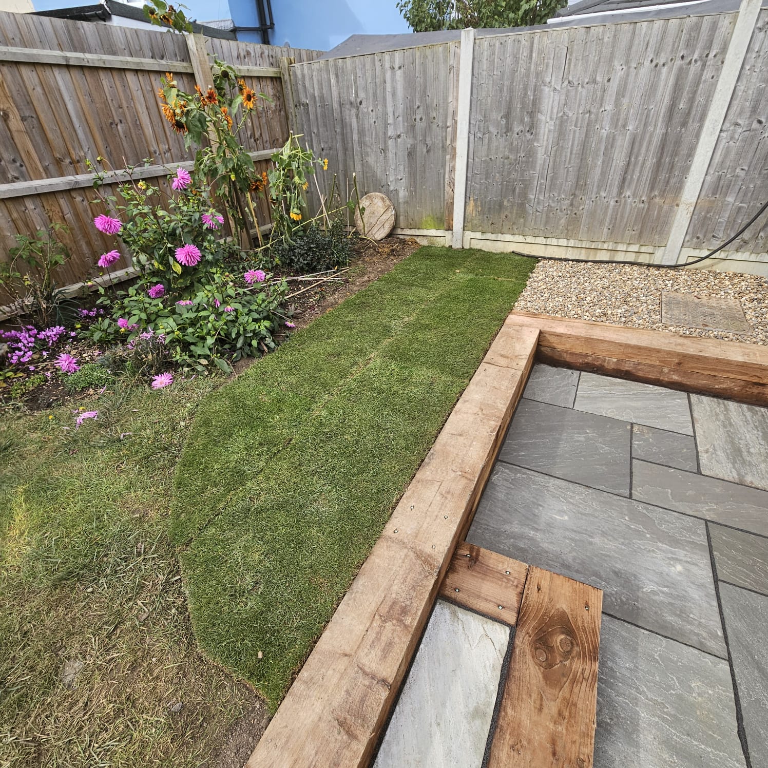 Instillation of a retaining sleeper wall and new Indian sandstone patio. Slab path also installed along the side of the conservatory. Small area of turf installed and stone area around raised manhole.